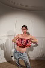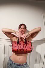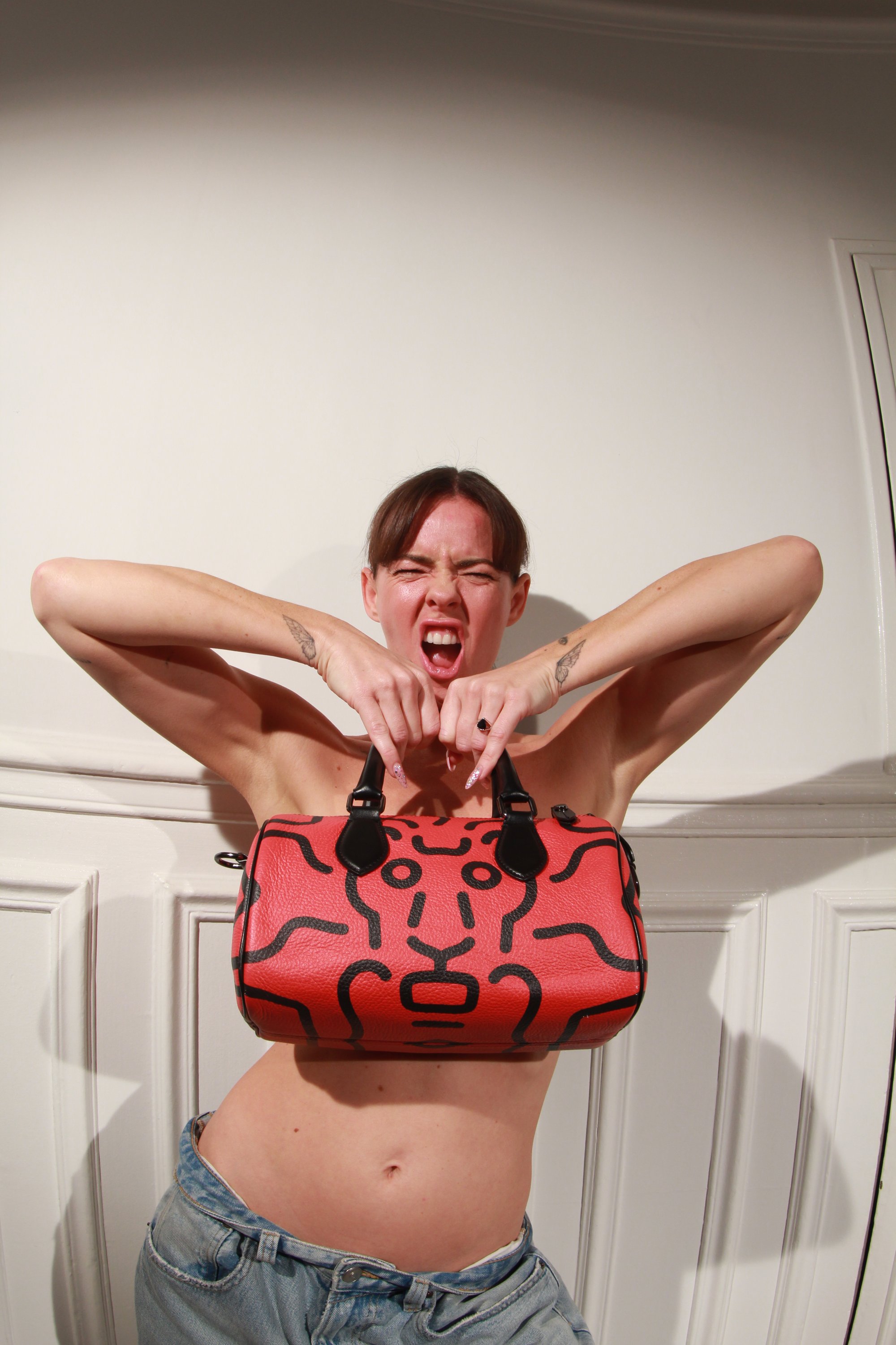 High quality red leather bag featuring two lions protecting the mother of the Olympian Gods